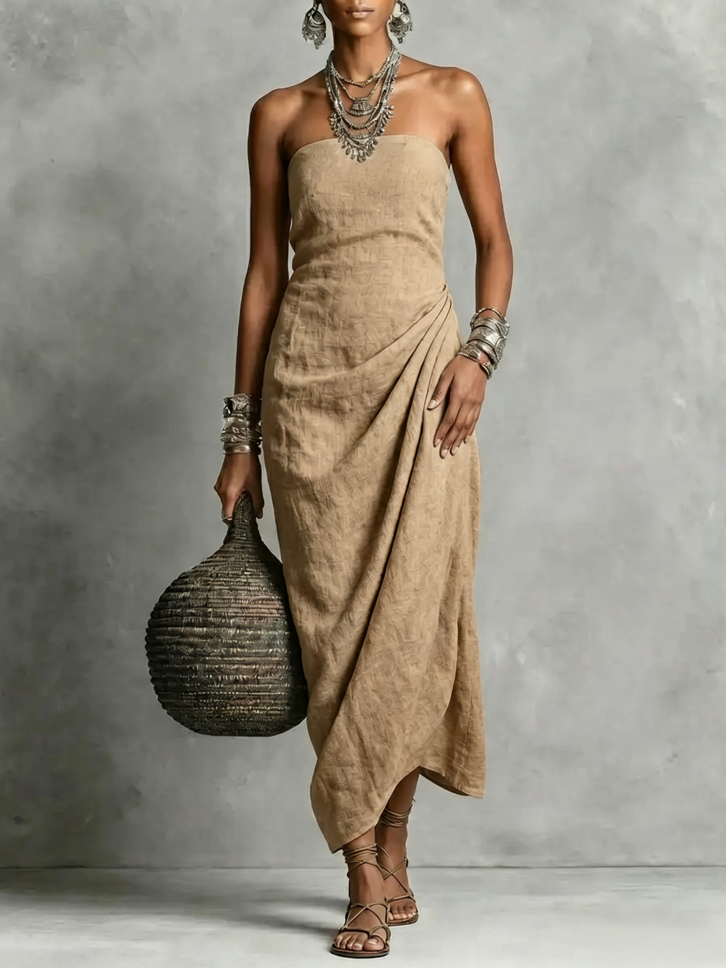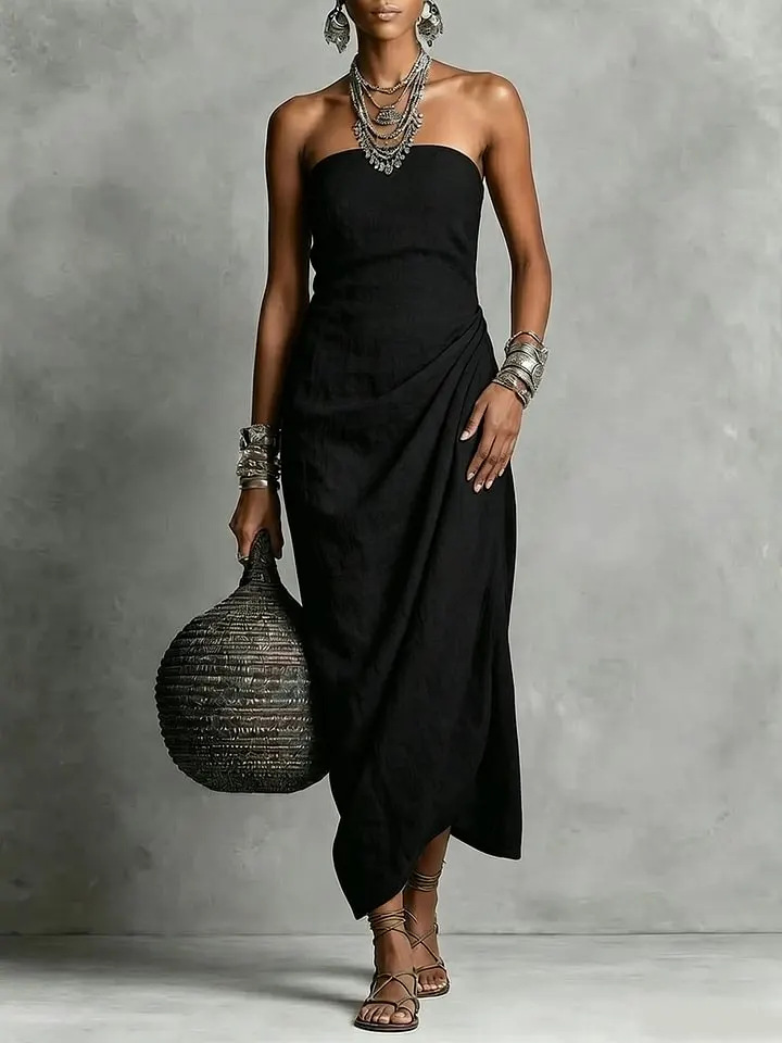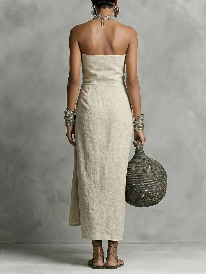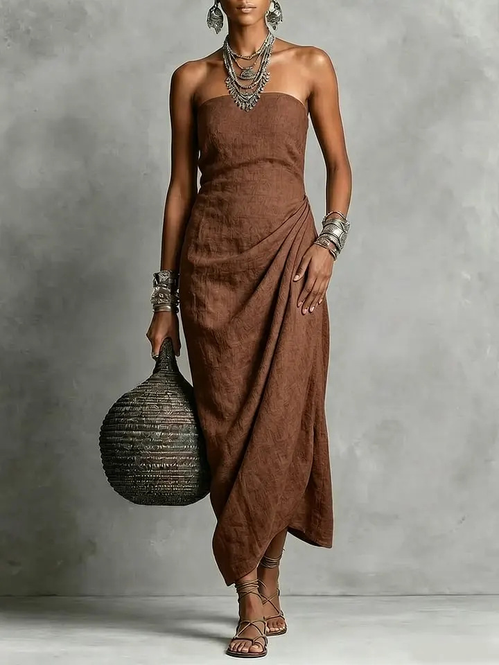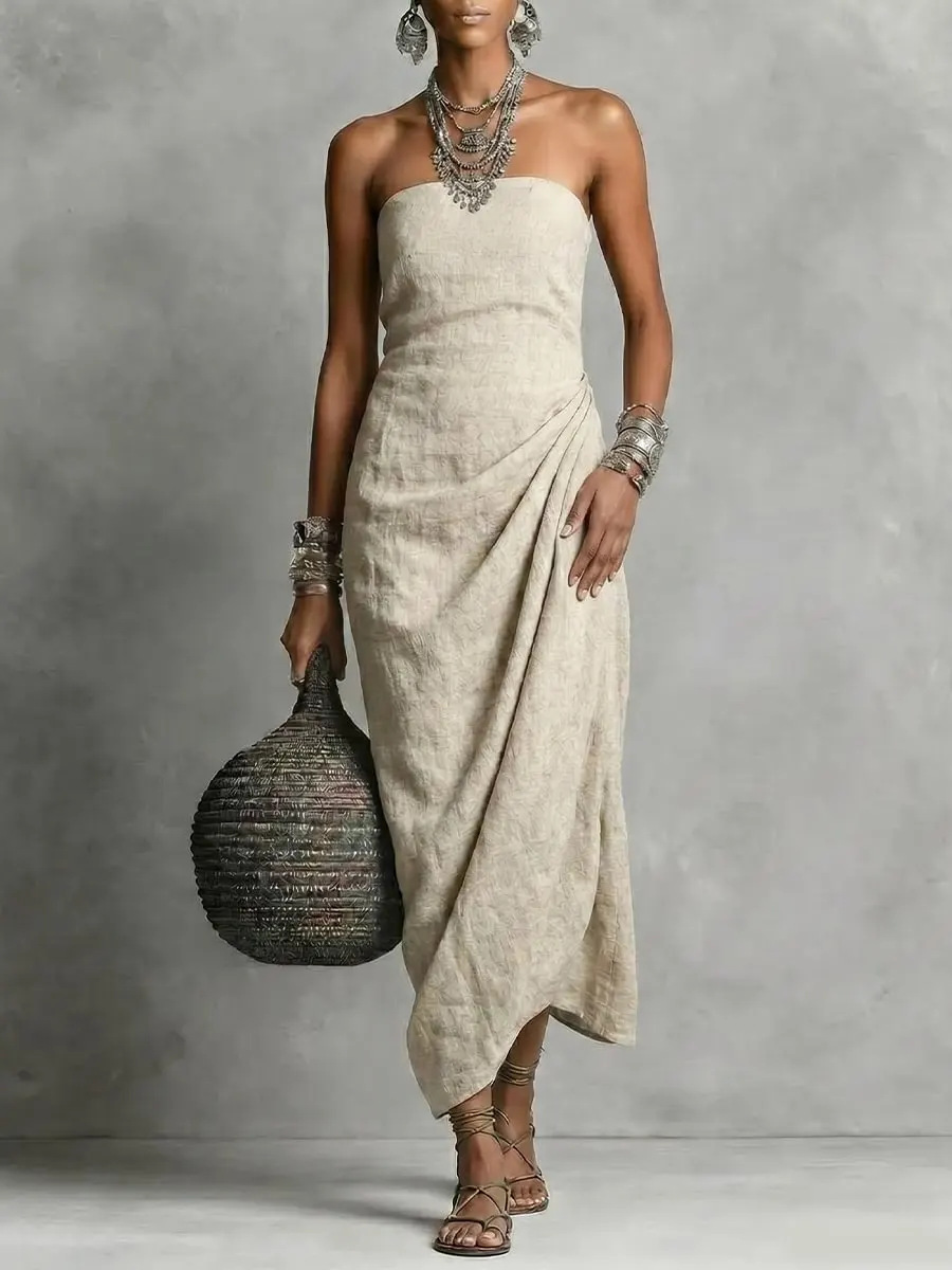 Strapless Pleated Linen Cotton Dress